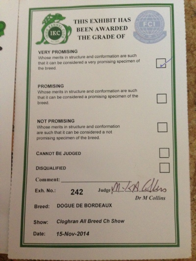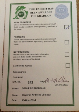 27.12.14. Dublin dog show Society Championship Show. Judge Mr A Matthews 1st place puppy bitch Graded very promising Donnajays top prospect .